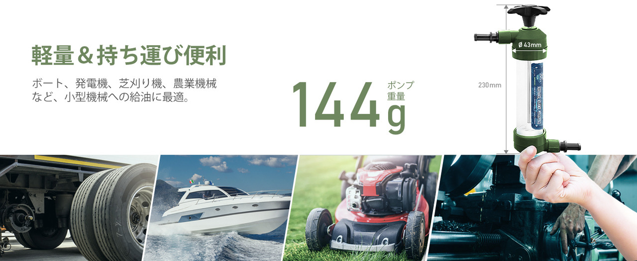 - 【対応機器】ボート、ジェットスキー、発電機、エッジャー、トリマー、芝刈り機、スノーモービル、ブロワー、農業機械など、小型機械への給油に最適です。