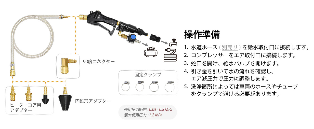 - 【ヒーター洗浄対応】5/8"、1/2"のヒーターコア用アダプターと、小型円錐形アダプターが付属し、ヒーター洗浄にも対応します。