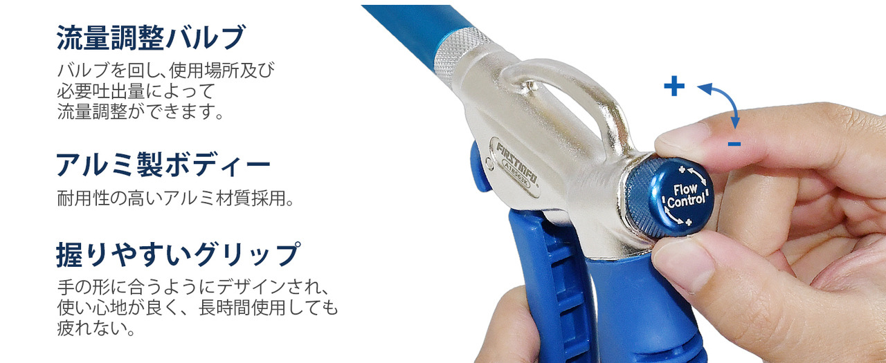 - 【流量調整バルブ】バルブを回し、使用場所及び必要吐出量によって流量調整ができます。