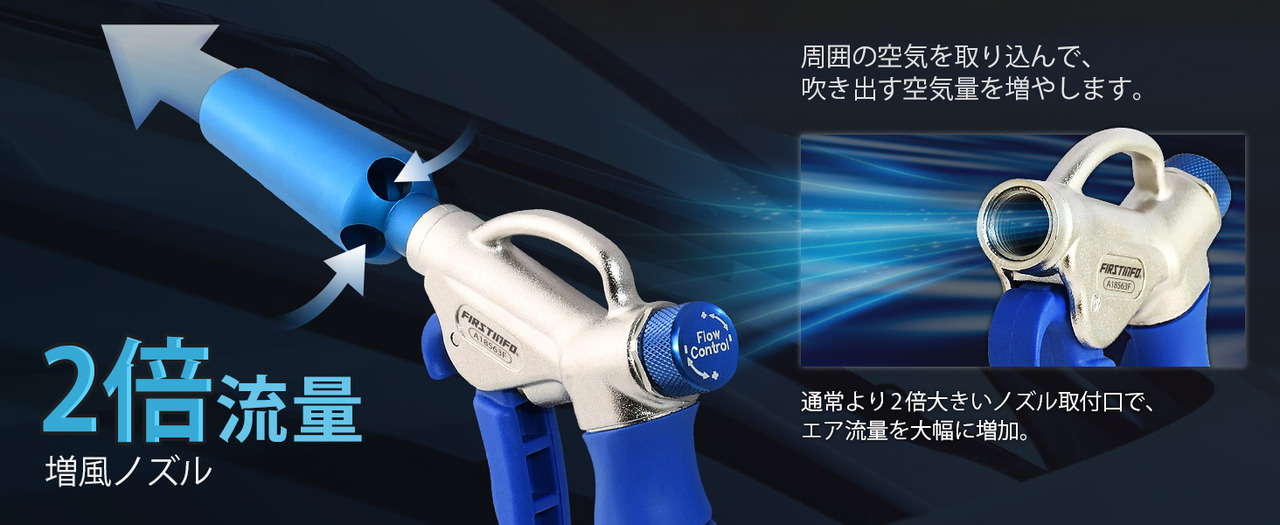 - 【大流量】通常のエアブローガンより2倍大きいノズル取付口で、空気流量を大幅に増加。
