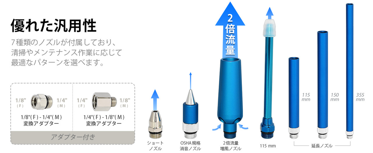 - 【ノズル交換可能】1/8から1/4のノズル取付口変換アダプターが付属。別売りのノズルに交換可能。