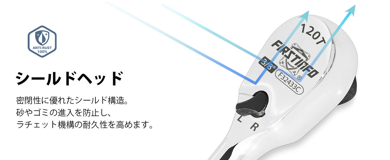 - 【120歯ギア】 歯数120ギアのラチェット機構。送り角は3°で、振り幅が僅かしか取れないような狭い場所で活躍します。