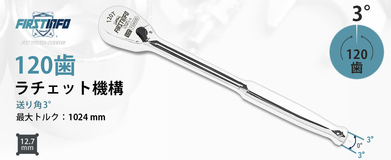 - 【120歯ギア】 歯数120ギアのラチェット機構。送り角は3°で、振り幅が僅かしか取れないような狭い場所で活躍します。