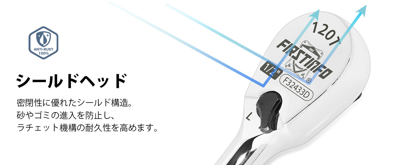 - 【シールドヘッド】シールド構造は密閉性に優れ、砂や細かいゴミなどが内部に入るのを防ぎます。ラチェット機構の耐久性を高めます。
