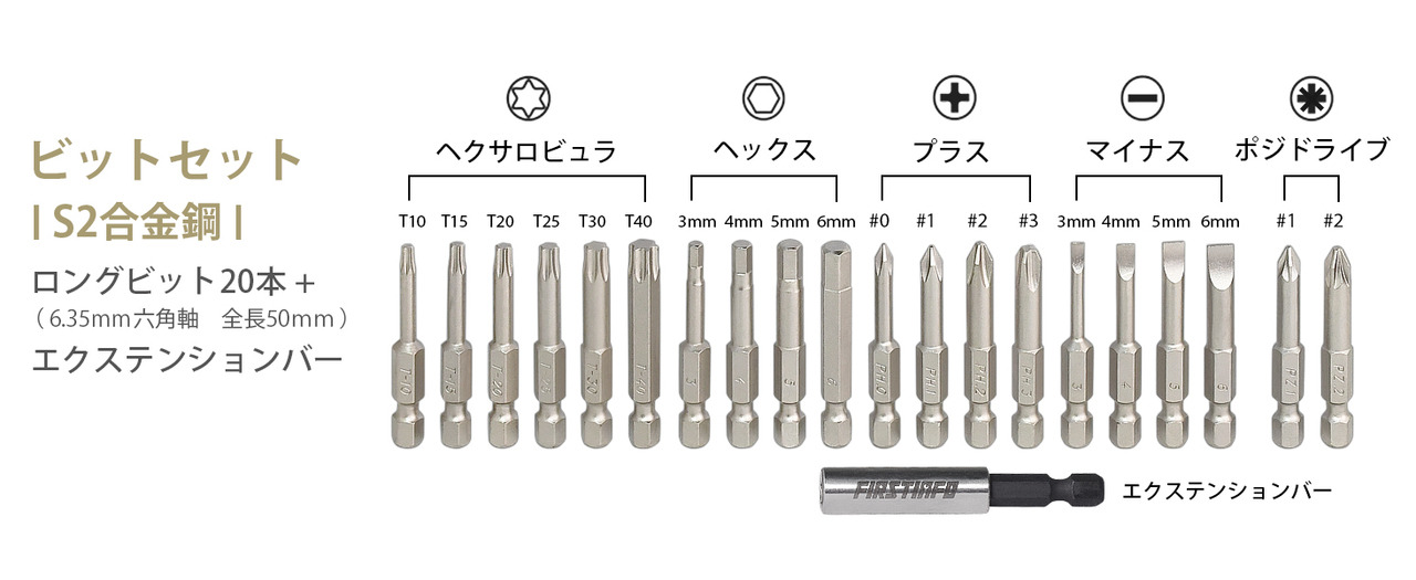 - ビット詳細:【プラス】PH0、PH1、PH2、PH3 (各サイズ2本) 【マイナス】4mm、6mm 【ヘックス】3mm、4mm、5mm、6mm 【ヘクサロビュラ】T10、T15、T20、T25、T30、T40 【ポジドライブ】PZ1、PZ2; ソケットアダプター1本、ビットエクステンションバー1本