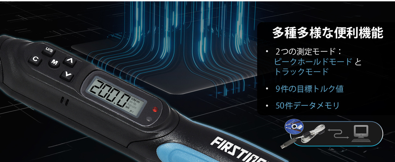 - 【9件目標トルク値・50件データメモリ】トルク値を登録することで、頻度の高い作業や繰り返し作業に便利です。データメモリは50件で、メモリー機能によりトルクデーターを管理できます。