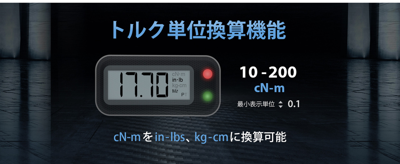 - 【音・LED通知】設定トルクの90%でブザーの断続音と共にLEDが緑色に点滅、100%でブザーが連続音に変わりLEDが赤色に点灯します。液晶画面で見えない角度でも簡単に確認できます。